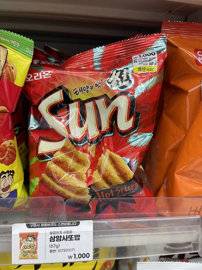 옥수수와 밀가루 베이스로 만들어진 웨이브형 스낵인 썬칩은 2000년대 초에 출시한 과자로 태양 아래 구운 듯한 고소함과 시즈닝이 찐하게 올라가는 타입이에요.