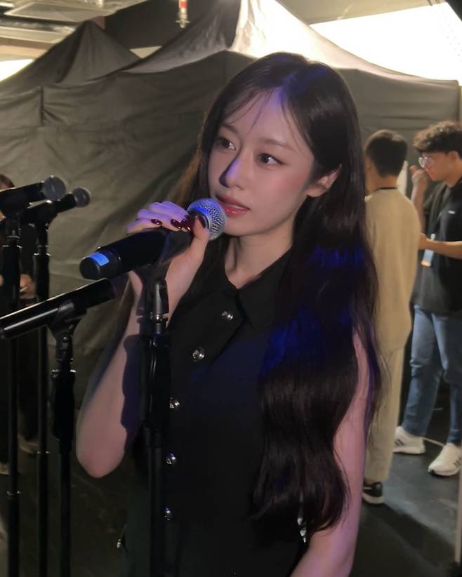 사진 속 지연은 버튼이 포인트가 되는 블랙 미니 원피스를 입고 아름다운 미모를 뽐내고 있습니다.