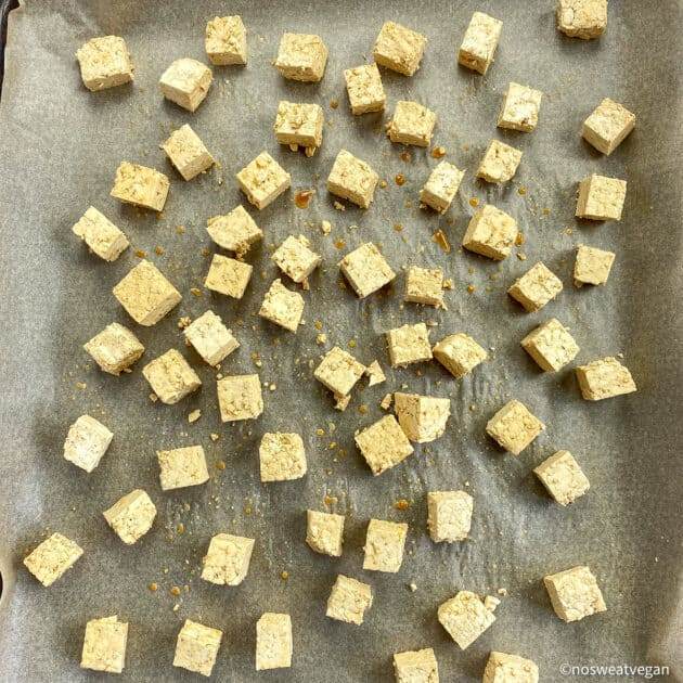 2. 썰어놓은 두부에 간장 1큰술과 전분가루를 살짝 뿌려 버무려준 후, 200도 오븐(또는 에어프라이어)에서 20분간 구워줍니다. 더 바삭한 식감을 원한다면 5분 더 익혀도 좋습니다.