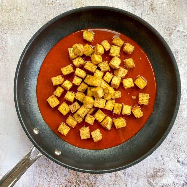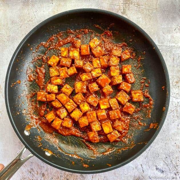 4. 팬에 양념을 넣고 약불로 살짝 끓이다가 구운 두부를 넣고 중불에서 23분간 졸여줍니다. 양념이 걸쭉해질 때까지 가볍게 저어줍니다.