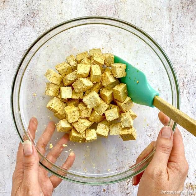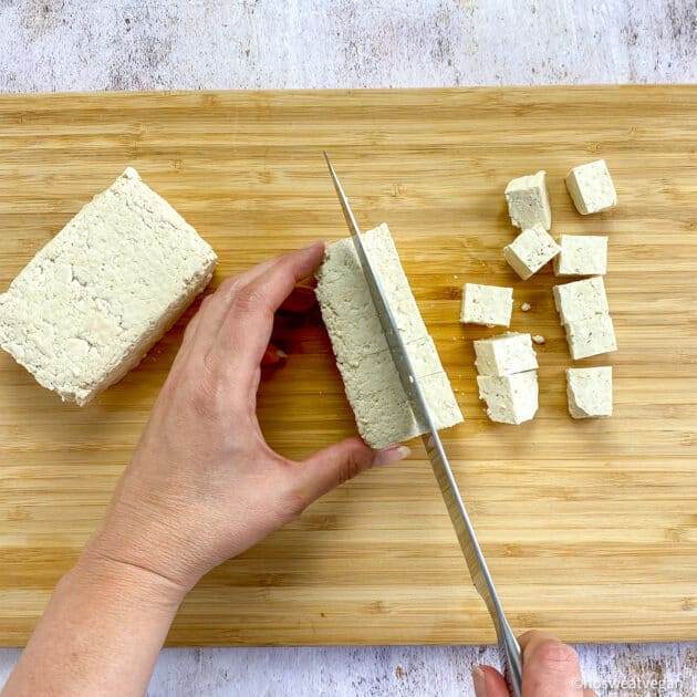 1. 두부는 키친타월로 감싸고 무거운 접시를 올려 1530분간 눌러 물기를 제거한 뒤, 큐브 모양으로 썰어줍니다.