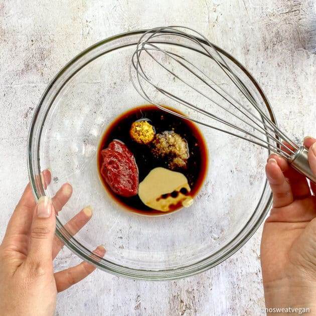 3. 두부가 구워지는 동안 고추장 양념을 만듭니다. 볼에 고추장, 간장, 타히니, 아가베시럽, 식초, 다진 마늘과 생강, 물을 넣고 잘 섞어 주세요.