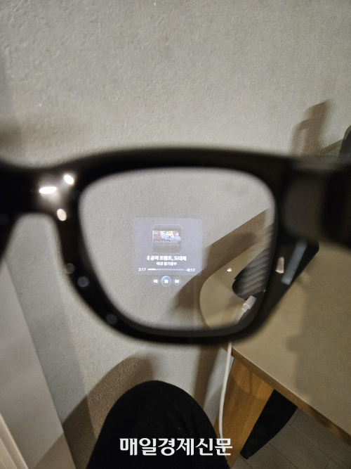 메타 디스플레이의 가장 유용한 기능 중 하나. 바로 음악듣기입니다. AI 안경들은 기본적으로 ‘오픈형 이어폰’입니다. 귓구멍에 이어버드를 꽂지 않아도 안경테에 있는 스피커를 통해서 음악을 들을 수 있습니다. 시끄러운 지하철이나 대로 근처에서는 거의 들리지 않지만 조용한 사무실이나 방안에서는 꽤 음악이 잘 들립니다. 특히 어느 정도 볼륨 이하에서는 내가 듣고 있는 것이 상대방에게 들리지 않기 때문에 일을 하면서 음악을 듣는 것도 가능합니다. 언제든지 저를 찾는 사람을 위해 귀를 열어두면서도 내가 필요한 정보를 계속 듣을 수 있기 때문입니다.