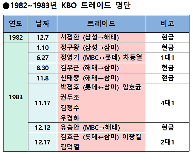 잘 알려져 있다시피 KBO 역대 1호 트레이드 주인공은 서정환. 1982년 12월 7일 삼성에서 해태(현금 트레이드)로 건너갔다. 그 이후 1983년 1월 10일 삼성 정구왕이 역대 2호 트레이드로 삼미 슈퍼스타즈로 이적했고, 6월 27일 MBC 유격수 정영기와 롯데 포수 차동열이 유니폼을 바꿔 입었다. 11월 17일에는 롯데가 임호균을 영입하기 위해 박정후, 권두조, 김정수, 우경하 4명을 내주는 대형 트레이드를 단행하기도 했다.