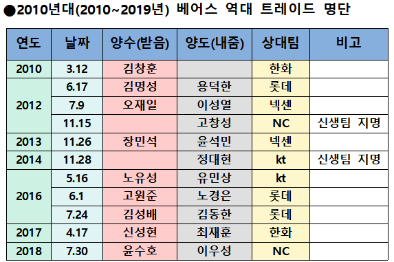 역대 트레이드 명단 중에는 KBO 신생팀 창단으로 인한 트레이드도 포함됐다.