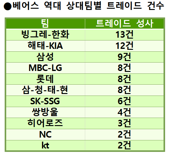 구단별로 살펴보면 가장 많은 딜을 성사시킨 파트너는 한화(빙그레 포함) 이글스였다. 1985년 12월 김우열 김일중을 시작으로 총 13건의 트레이드가 이뤄졌다.