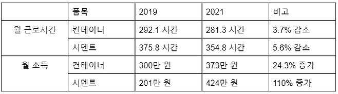 여전히 시멘트의 경우 월 근로시간이 여전히 주 90시간에 육박하지만 월 근로시간은 다소 줄었습니다. 경유가가 급등했음에도 불구하고 유가 인상분을 적정 임금에 반영해 주는 안전운임제 덕분에 소득은 큰 폭으로 늘었습니다. 교통연구원 자료를 보면 화물 운송 운임은 지난 10년 사이 컨테이너는 0.41%, 시멘트 운임은 14.41% 인하된 상태였습니다.