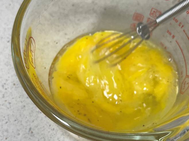 볼에 계란을 깨 넣고 맛술 1스푼과 소금 2~3꼬집을 더해 주세요. 맛술은 계란의 비린내를 잡아주고, 감칠맛을 더합니다.
