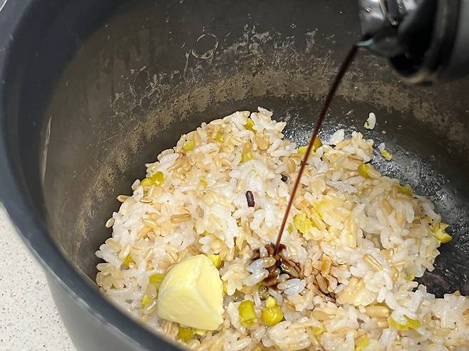 밥알 사이로 스며든 간장과 녹아내린 버터가 어우러져 고소하면서도 깊은 풍미를 더해줍니다. 이렇게 하면 김밥의 밑간을 해주어, 계란 하나만 넣어도 훨씬 풍부한 맛이 납니다.