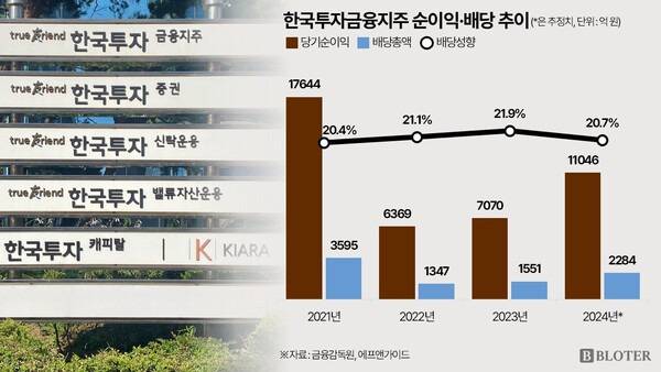 한국금융지주는 중간배당 없이 회계연도 결산 기준으로만 배당을 시행한다. 올해 정부 주도로 밸류업(기업가치 제고) 프로그램이 가동되면서 금융투자 업계 전반적으로는 주주환원율을 최소 30% 이상으로 제시하는 분위기가 고착됐다. 대부분 배당성향 20% 이상에다 자사주 매입 및 소각 규모를 합산한 목표치 제시가 주를 이룬다.