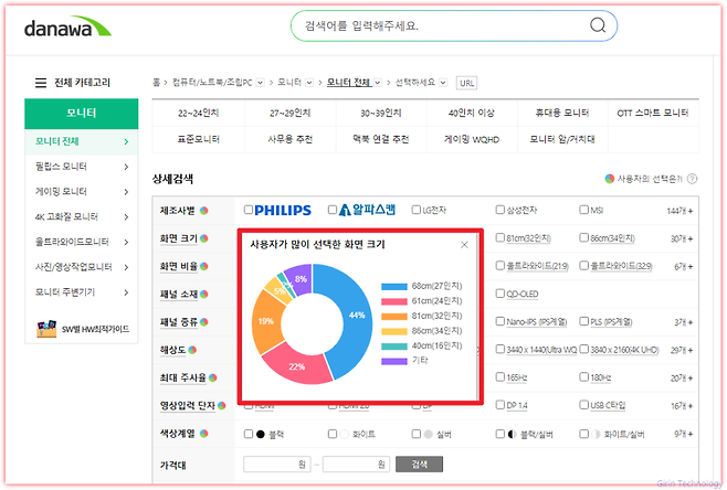 다음으로 삼성전자의 오디세이 G5 S27CG550 게이밍 모니터 크기에 대해 알아 보겠습니다. 요즘 모니터 사이즈는 27인치가 대세 인데요. 다나와의 모니터 카테고리 통계를 살펴 보더라도, 소비자들이 가장 많이 선택하는 사이즈가 바로 27인치 입니다.