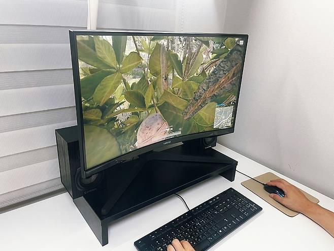 실제로 제 테이블 위에 올려 놓고 사용하기에 딱 적당한 사이즈 였는데요. 게임을 할때나 PC 문서 작성을 할때 도 눈의 피로감도 덜 해 장시간 사용해도 편안 했습니다.