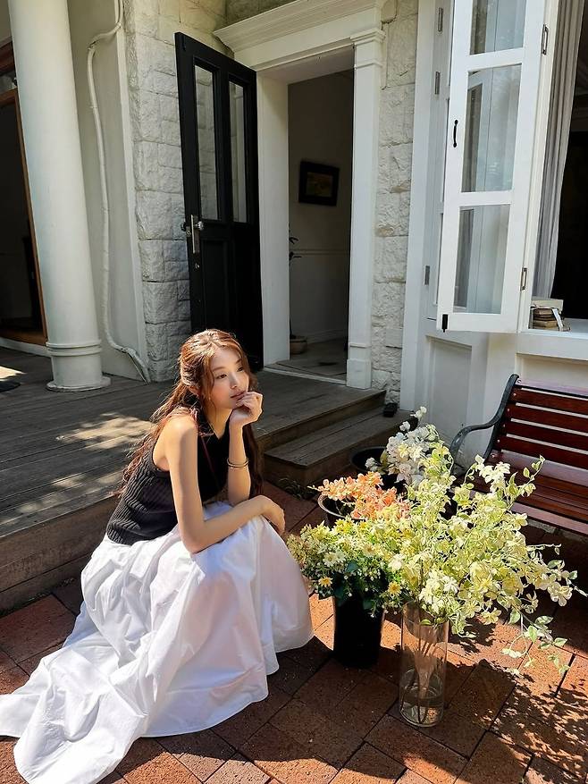 상의는 슬림한 니트 소재의 블랙 슬리브리스로, 어깨 라인과 팔의 실루엣을 강조해 전체적으로 균형 잡힌 실루엣을 만들어냈다. 하의로는 하늘하늘한 광택감의 화이트 롱스커트를 선택해 청순하면서도 우아한 분위기를 더했다. 자연광에 반사되는 스커트의 텍스처는 햇살 아래 더욱 돋보였으며, 플라워 버킷과 함께한 연출이 감각적인 정원 사진집을 떠오르게 한다.