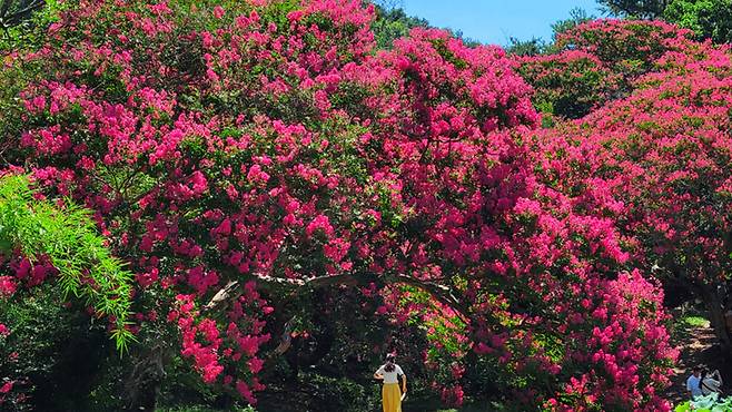 정원에는 수령 100년이 넘은 배롱나무가 20여 그루 서 있다. 굵고 거친 나무줄기에서 피어나는 붉은 꽃들은 오랜 세월을 품은 듯한 깊이를 느끼게 한다.