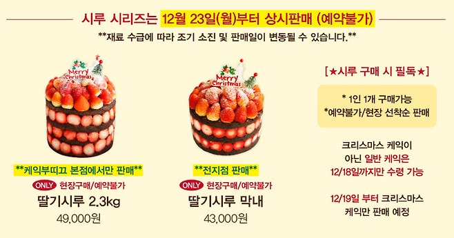 시루 시리즈는 12월 23일 월요일부터 상시판매했으며 예약은 불가했다. 시루 케이크는 1인 1개로 구매제한을 두고 있었으며 딸기시루 2.3kg은 케익부띠끄 본점에서만 판매됐다.