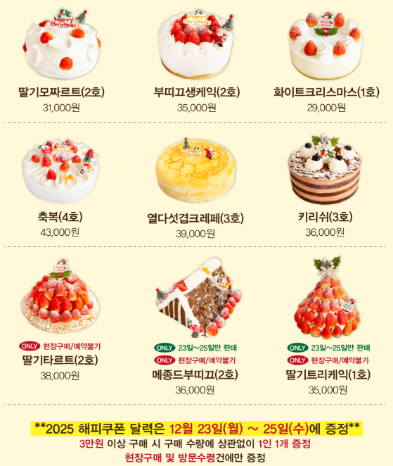 딸기타르트(2호) 38,000원 상품도 현장에서만 판매됐으며 23일~25일만 한정으로 메종드부띠끄(2호) 36,000원, 딸기트리케익(1호) 35,000원 상품이 판매됐다. 성심당 측은 3만 원 이상 구매 시 구매수량에 관계없이 1인 1개의 해피쿠폰 달력도 23일~25일에 현장구매 및 방문수령건에 한해 증정한다고 밝힌 바 있다.