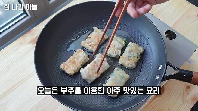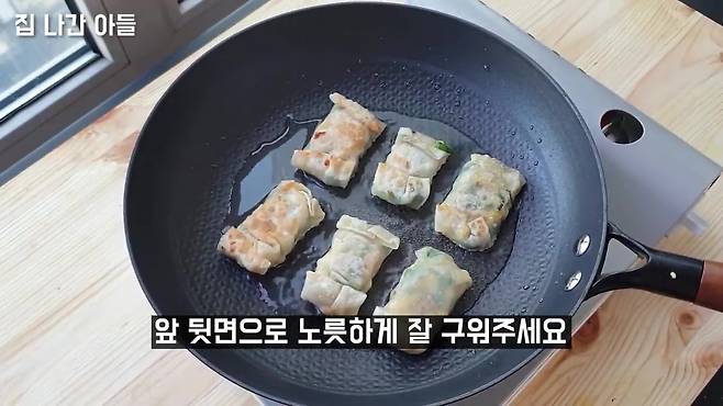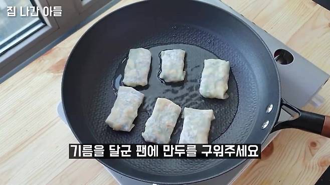 중불에서 3~4분씩 구우면 겉은 바삭, 속은 촉촉한 만두가 완성돼요.