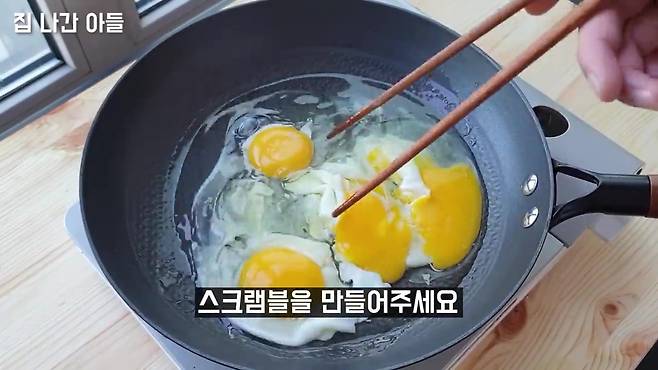 계란 2~3개를 풀고 팬에 기름을 두른 뒤 스크램블을 만듭니다. 젓가락으로 가볍게 저어 부드럽게 익혀주세요. 이 계란이 당면 대신 만두 속의 볼륨을 채워줍니다.