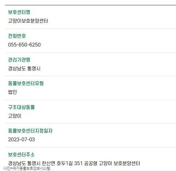 우선 고양이학교가 어떤 방식으로 운영되는지 알아야 했다. 국가동물보호정보시스템에는 고양이보호분양센터와 통영시동물보호센터가 통영시의 동물보호센터로 등록되어 있다. 즉, 지역의 유기동물관리 업무를 담당하는 시보호소의 기능을 수행한다고 볼 수 있다.