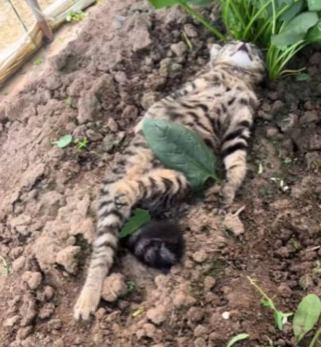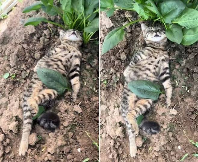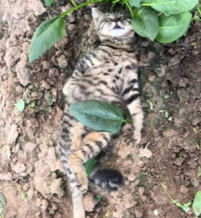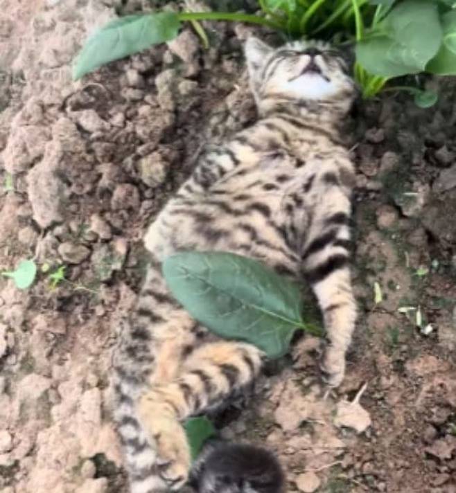사연은 이렇습니다. SNS상에는 화단에 누워서 나뭇잎으로 배를 가린 상태로 세상 여유롭게 휴식을 즐기고 있는 고양이 모습이 담긴 영상이 올라왔죠.