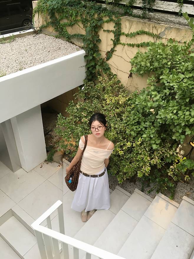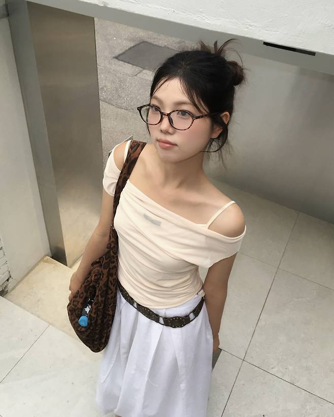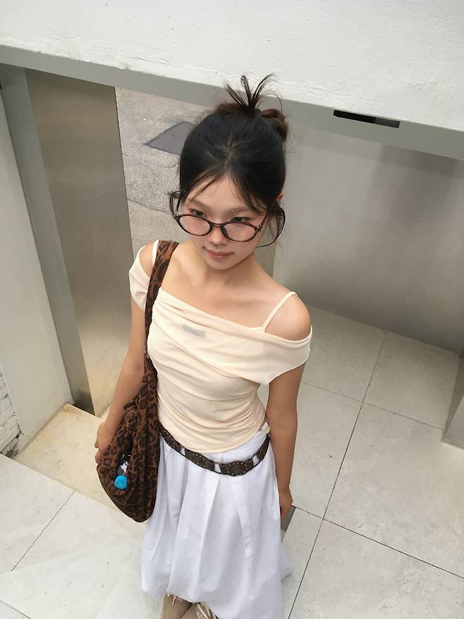 안경과 오프숄더로 포인트를 준 두 번째 룩,