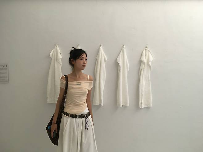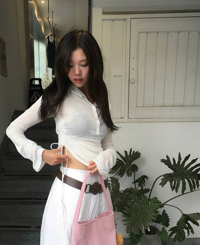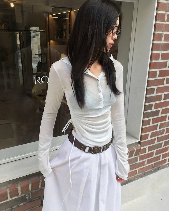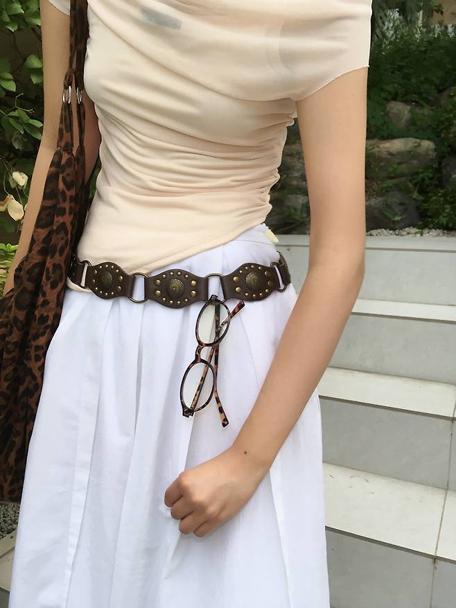 스커트와 벨트는 앞서 코디와 동일하지만, 아이템 배치로 전혀 다른 무드를 보여줍니다.