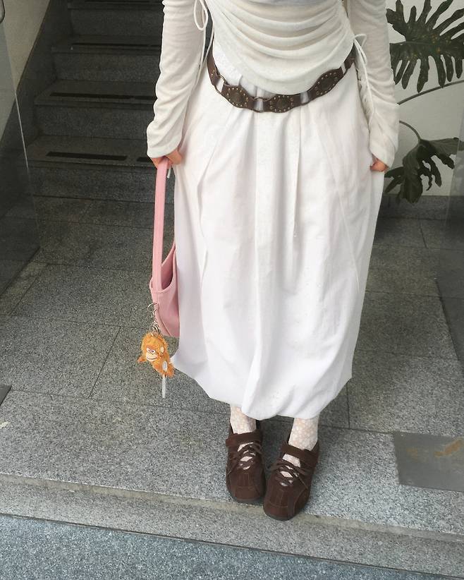 전체적으로 화이트 아이템으로 통일하고, 브라운으로 포인트를 더한 코디예요.