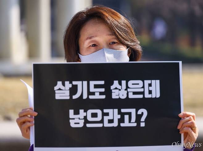 | ▲ 2021년 3월 8일, 정치하는 엄마들, 페미니즘당 창당모임 회원들이 서울 종로구 청와대 앞 분수대에서 3.8 세계여성의 날을 맞아 '여성은 숫자가 아니라 사람이다' 기자회견을 열고 20대 여성 자살률의 사회적 문제 인식을 강조하고 있다. |
