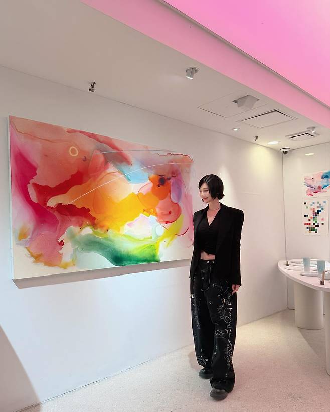 클라라가 갤러리에서 선보인 블랙 앙상블이 시선을 사로잡고 있다. 오버사이즈 블랙 재킷과 하이웨이스트 블랙 팬츠의 조합으로 모던한 실루엣을 완성했다. 짧은 단발 헤어스타일과 함께 미니멀한 스타일링을 연출하며 예술작품 앞에서 자신만의 존재감을 드러내고 있다. 특히 벽에 걸린 화려한 색감의 추상화와 대비되는 올블랙 의상은 갤러리 공간과 완벽한 조화를 이루며 세련된 아트 감상자의 모습을 보여주고 있다.