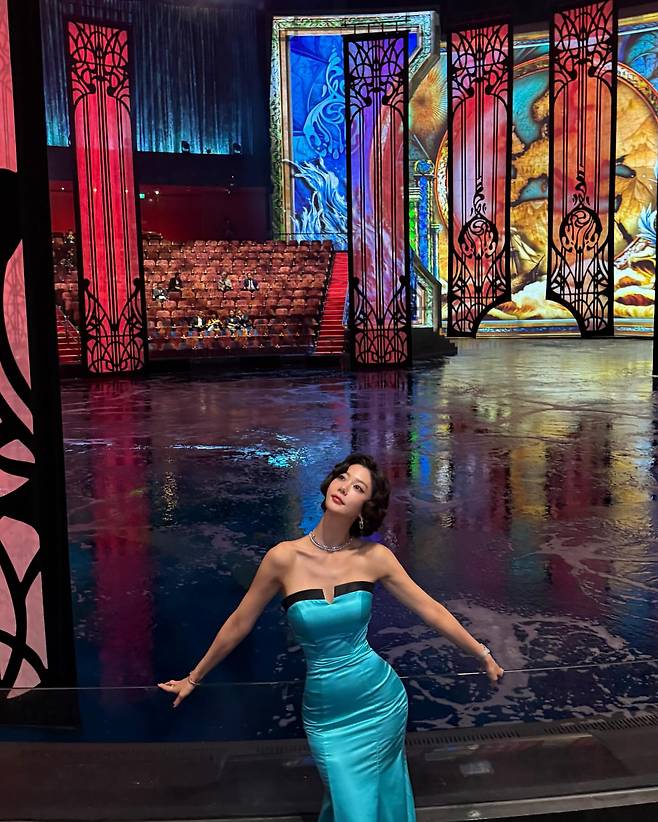 화려한 무대 배경 앞에서 클라라가 선보인 터쿼이즈 블루 드레스가 눈길을 끌고 있다. 몸매를 완벽하게 감싸는 실크 소재의 드레스는 스트랩리스 디자인으로 우아한 어깨라인을 강조하고 있다. 미니멀한 주얼리와 업스타일 헤어로 드레스의 존재감을 극대화하는 스타일링을 선보이며, 화려한 조명과 무대 배경이 드레스의 색감을 더욱 돋보이게 하고 있다. 레드카펫을 밟는 할리우드 스타를 연상케 하는 완벽한 이브닝 룩을 연출하고 있다.