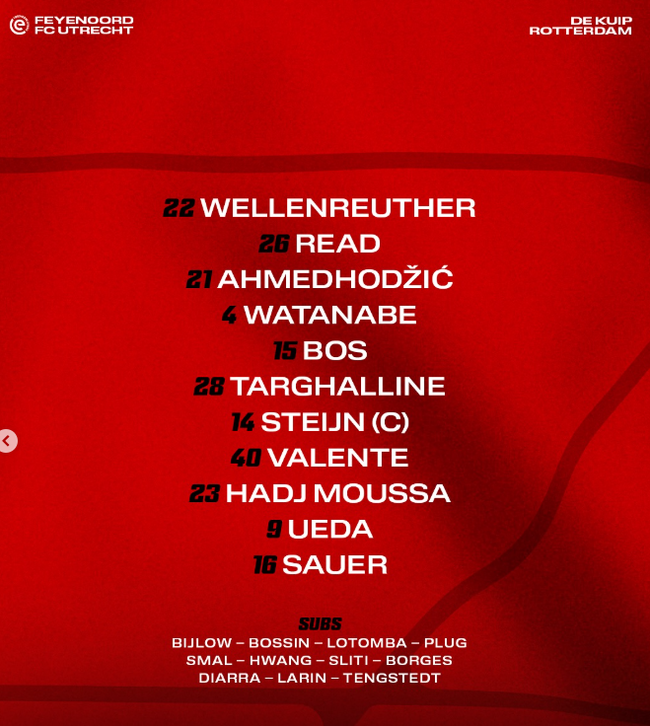 무패 행진을 이어가려는 페예노르트가 총력전을 펼친다. 로빈 반 페르시 감독은 3-4-3 포메이션을 가동했고, 공격진은 우에다, 사우에르, 하지 무사가 구축한다. 중원은 보스, 타갈린, 스테인, 발렌테, 3백은 리드, 아흐메드호지치, 와타나베가 지킨다. 골키퍼 장갑은 벨렌로이터가 낀다. 황인범은 벤치에서 시작한다.