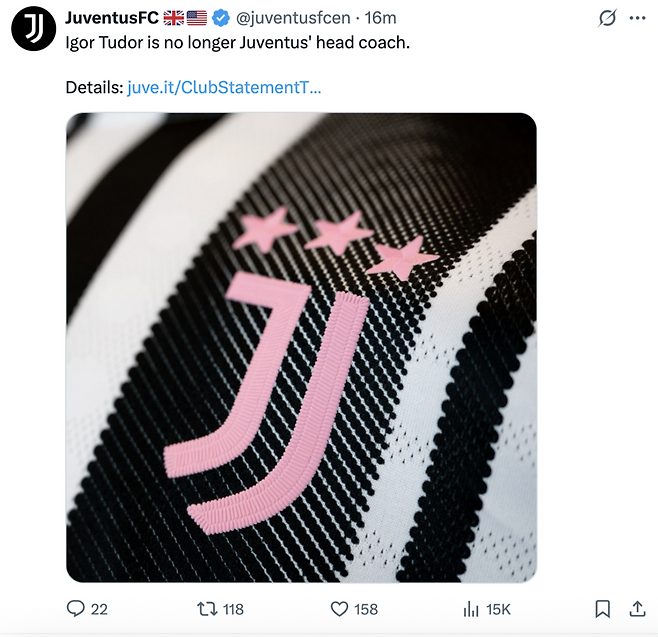 이어 “유벤투스는 지난 몇 달 동안 보여준 투도르 감독과 코칭스태프의 헌신에 감사를 표한다. 그들의 앞으로의 커리어에 행운이 함께하길 바란다”라고 알렸다.