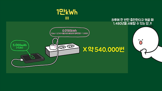전기 없는 세상은 상상도 할 수 없을 정도로 산업과 일상생활에 필요한 에너지입니다. 우리나라 1인당 연간 전력 소비량은 약 1만kWh인데, 스마트폰 배터리 용량이 5,000mAh(=5Ah)라고 했을 때 1회 충전 시 약 0.0185kWh의 전기를 사용하므로 1만kWh는 스마트폰을 약 54만 번 정도 충전할 수 있는 어마어마한 양입니다.