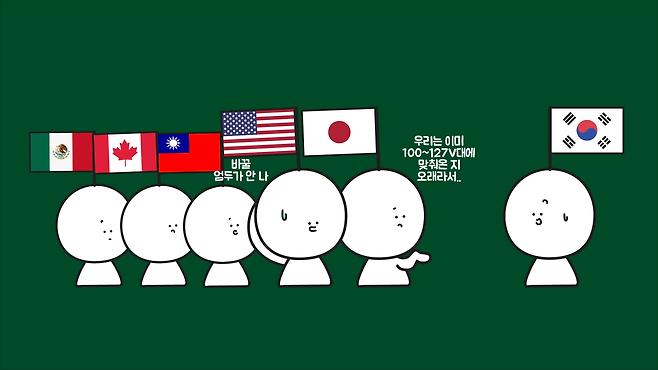 220V가 일반적으로 사용하기에 적합하고, 미국이나 일본 등의 국가들도 220V로 승압하면 더 좋다는 사실을 잘 알고 있으나 국가적 인프라가 이미 많이 깔린 상황이라 막대한 비용과 시간을 감당하기에 한계가 있고, 우리나라처럼 상황이 잘 맞아떨어지지 못했기 때문입니다.