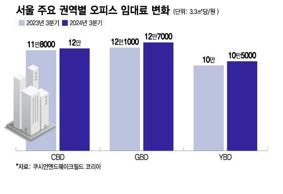 3분기 3대 권역 오피스 3.3㎡당 평균 임대료는 전년 동기 대비 3.4% 상승한 약 12만원으로 집계됐다. 특히 GBD 임대료가 3.3㎡당 12만7000원으로 CBD(3.3㎡당 12만원)를 제치고 서울에서 가장 임대료가 높은 권역으로 자리매김했다. 공급이 제한적인 가운데, 임차 공간이 부족해 임대료가 치솟은 것으로 풀이된다.