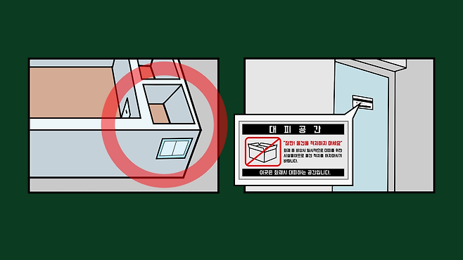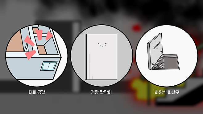다음으로 자기 집에서 밖으로 대피가 어려운 상황이라면 집안의 대피 공간이나 경량 칸막이, 하향식 피난구 등이 설치된 곳으로 대피해야 합니다.