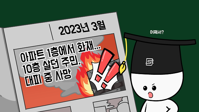 대표적인 최근 사례가 2023년 3월 1층에서 발생한 화재로 인해 10층에 살던 주민이 대피 장소가 있는 옥상으로 이동 중에 연기흡입으로 사망한 사건입니다.