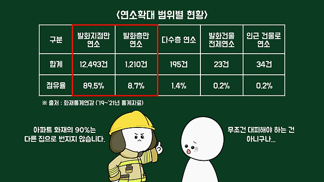 아파트에서 화재가 발생하면 엘리베이터나 계단 등의 수직 통로를 통한 연기 확산이 매우 빠르기에 이런 사고가 발생한 것인데, 연소확대 범위별 현황을 살펴보면 아파트 화재의 대부분은 발화지점(89.5%) 및 발화층(8.7%)만으로 연소범위가 국한되고, 다수층으로 화재가 확대되는 비율(1.4%)은 매우 제한적입니다.