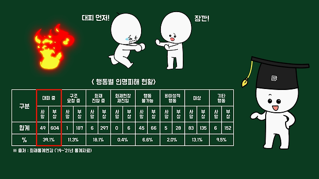 그래서 2019년도에는 불나면 대피 먼저를 대대적으로 강조했는데, 아파트 화재 통계분석을 했을 때 아파트 화재의 사상자 중 39.1%가 대피 중에 발생했음을 알 수 있습니다.