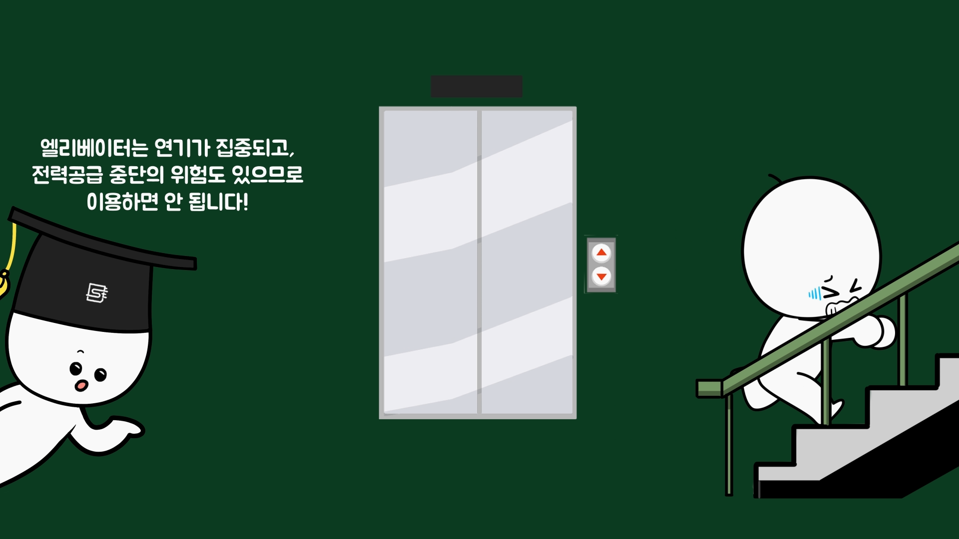 그런데 이 상황에서 화염이나 연기가 들어온다고 판단될 때에는 대피 및 구조요청이 필요합니다. 복도나 계단에 화염이나 연기가 없으면 계단을 이용해 지상층이나 옥상 등 안전한 장소로 대피해야 합니다.