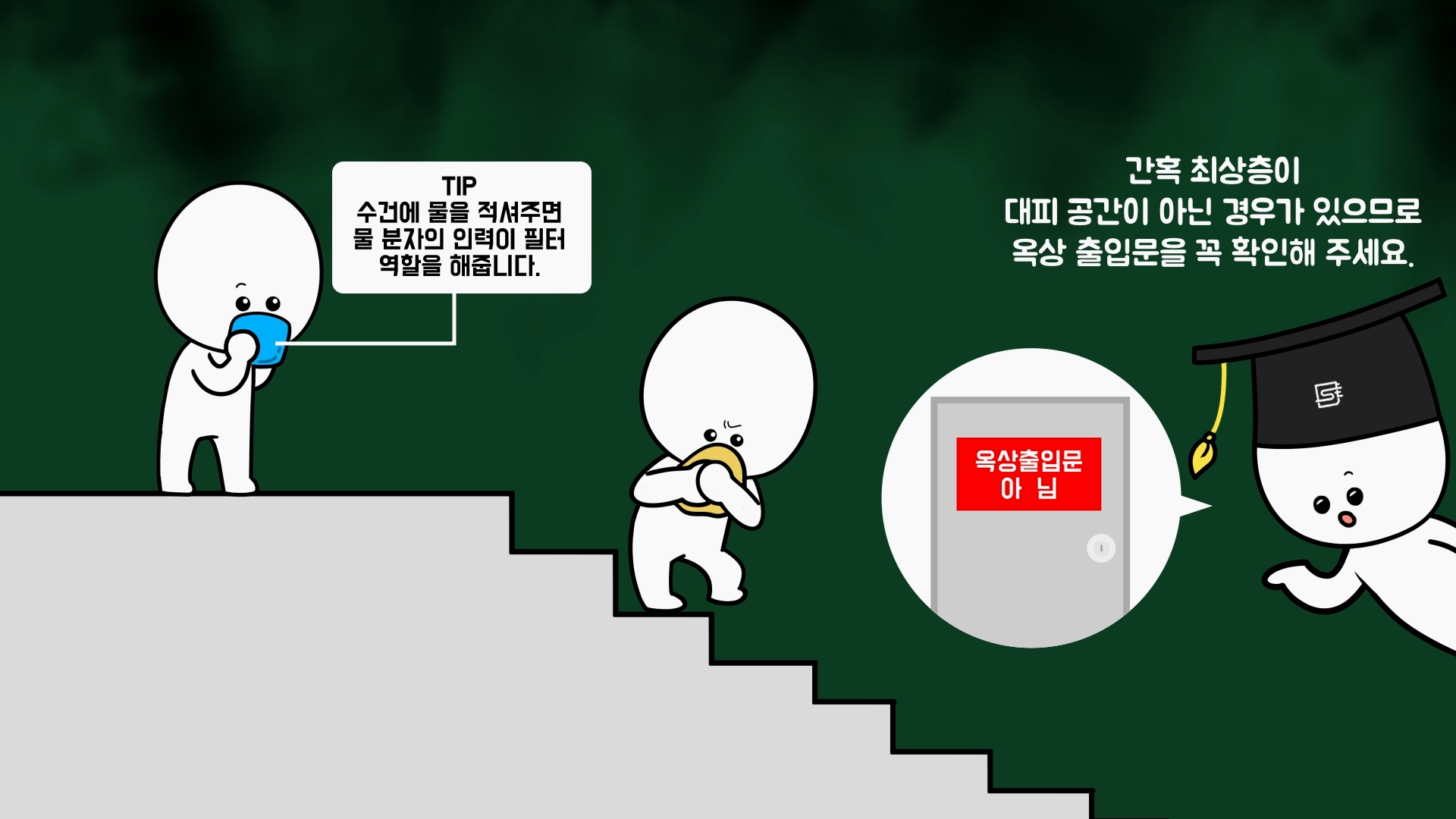 만약 복도나 계단에 화염이나 연기가 있으면 밖으로 대피하지 말고, 집안의 대피 공간이나 경량 칸막이, 하향식 피난구 등이 설치된 곳으로 이동해야 합니다.