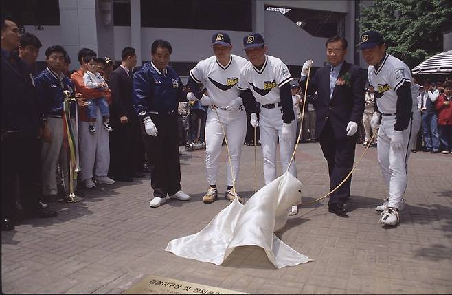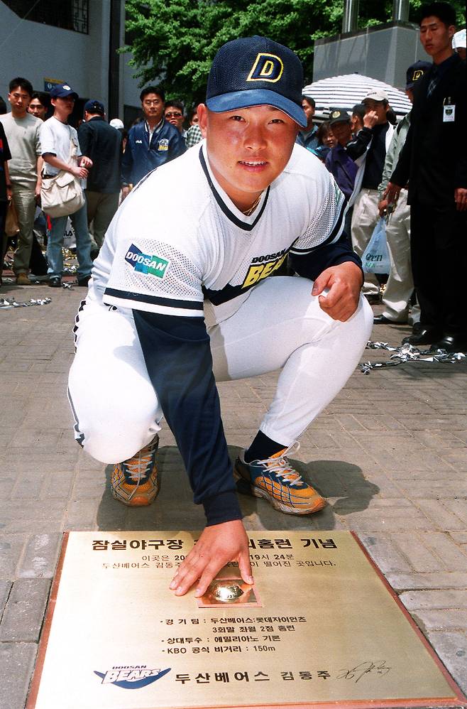 두산 구단은 이를 기념하기 위해 동판 제작에 나섰다. 그리고는 17일 뒤인 2000년 5월 21일 동판 제막식을 열었다. 주인공 김동주는 물론 두산 강건구 사장과 곽홍규 단장, 김인식 감독, 주장 김태형 등이 참석해 잠실구장과 잠실종합운동장역 사이에 설치된 동판 앞에서 행사를 치렀다.