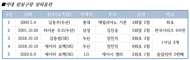 『두산 김동주(24)가 잠실구장 개장 이후 공식경기 첫 장외홈런을 기록, 파워배팅의 진수를 보여줬다. 김동주는 4일 잠실구장에서 열린 삼성fn.com 2000 프로야구 롯데와의 홈경기에서 1-1로 맞서던 3회 1사 1루에서 기론의 두 번째 볼을 강타, 좌측 지붕을 완전히 넘기는 150m짜리 대형 홈런포를 터뜨렸다.』 <연합뉴스 2000년 5월 4일자>