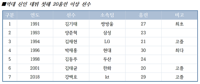 아무튼 KBO 역사에서 공식 기록지에 홈런 비거리가 150m로 새겨진 것은 역대 4번째였다. 원년이던 1982년 4월 8일 MBC 청룡의 선수 겸 감독 백인천이 OB전에서 동대문구장을 넘기는 장외홈런으로 처음 추정 비거리 150m를 기록했다. 이어 1987년 10월 27일 삼성 장효조가 잠실구장에서 펼쳐진 OB 베이스와 플레이오프 5차전 때 오른쪽 외야 관중석 상단에, 1997년 8월 1일 삼성 양준혁이 사직구장에서 펼쳐진 롯데전 때 오른쪽 스탠드 맨 꼭대기에 꽂히는 홈런으로 비거리 150m를 기록한 바 있다.