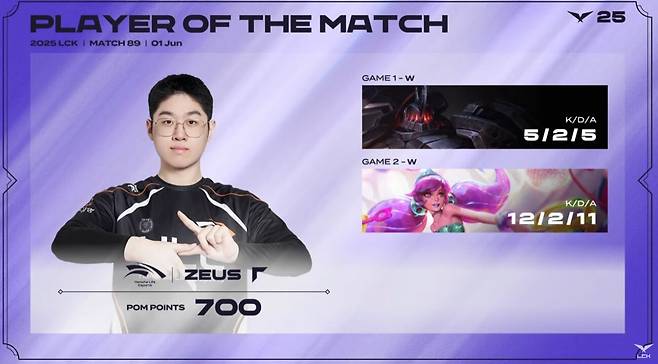 금일 사이온과 그웬으로 맹활약을 펼치며 POM에 선정된 '제우스' 최우제는 '쵸비'에 이어 700 포인트로 POM 2위다. '제우스'는 "POM을 받기가 힘든데 생각보다 많이 받은 것 같아 뿌듯하다"고 말했다. 그리고 "'Road to MSI'가 패치도 바뀌고 아직 기간이 많이 남아서 연습 때 잘 준비한 팀이 유리할 것 같다"고 전했다.