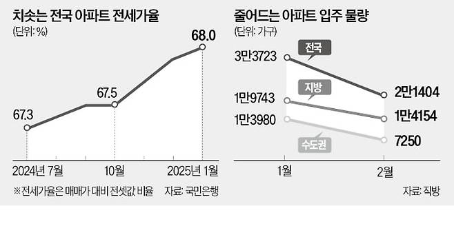 전셋값 안정에 큰 영향을 미치는 입주 물량도 줄어들고 있다. 부동산 정보업체 직방에 따르면 이달 전국 아파트 입주 물량은 2만1404가구로 1월(3만3723가구)보다 37% 줄었다. 이달 수도권 입주 물량은 7250가구로, 1월(1만3980가구)의 절반에 그칠 것으로 조사됐다. 지난해 7월 2318가구 이후 가장 적은 수준이다. 직방 관계자는 “지난달에는 서울과 경기 지역에서 대단지 입주가 이뤄지고 인천에서도 5개 단지가 입주했으나 2월에는 일부 중소형 단지만 집들이했다”고 설명했다.