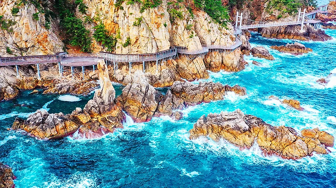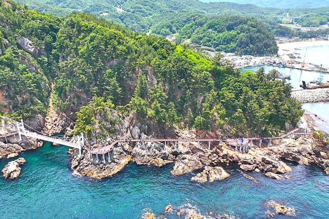 탐방로의 끝자락에는 이 길의 하이라이트가 기다린다. 길이 56m, 높이 약 11m의 출렁다리다. 중앙부에는 유리 바닥이 설치돼 있어, 발아래로 파도가 부서지는 모습을 그대로 내려다볼 수 있다.