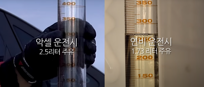 수치상으로 비교해 보면 약 770ml가 차이가 나는 모습을 볼 수 있었습니다. 일명 막운전에 비해 연비 운전을 했을 때 30% 이상 연비가 좋아지는 모습을 확인할 수가 있었습니다.