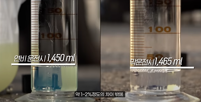 그 결과 연비 운전 시에는 1,450ml, 막 운전 시에는 1,465ml의 연료가 소모가 된 모습을 볼 수 있었으며 약 1~2% 정도의 차이밖에 나지 않는 모습을 볼 수 있었습니다. 처음 살펴보았던 21km 구간을 주행했을 때 더 많은 브레이크를 밟고 더 많은 급가속을 하다 보니 확연하게 차이가 발생했지만 두 번째 실험에서는 동일한 브레이크 횟수로 진행을 했을 때는 처음만큼 크게 차이가 나지 않았다는 특징이 있었습니다.