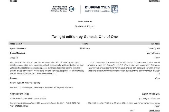 특히, 앞서 현대차는 지난 8월 4일 이스라엘 특허청(ILPO)에 관련 상표를 출원한 바 있다. 해당 상표는 '트와일라잇 에디션 바이 제네시스 원 오브 원(Twillight edition by Genesis One of One)'으로 해당 부서에서 선보일 첫 비스포크 모델의 이름으로 추정돼왔다.